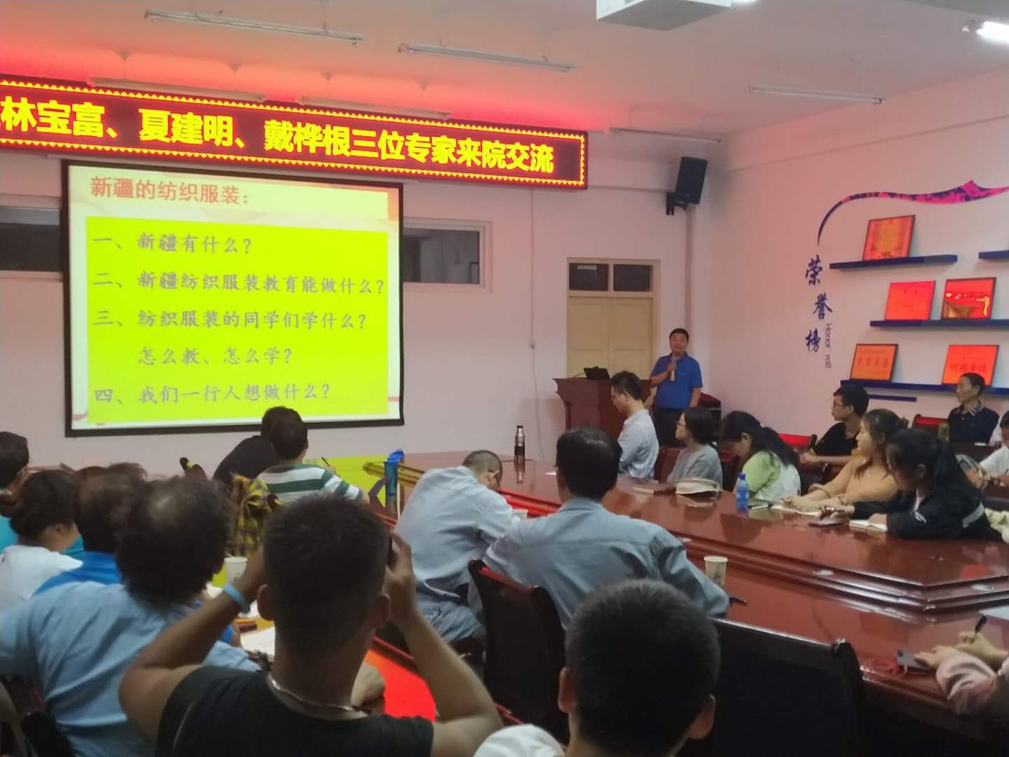 为服务“一带一路”倡议,助力南疆纺织服装产业发展,以本为本,强化纺织工程专业建设,培育该专业应用型人才,我校于8月30日邀请林宝富、夏建明、戴华根三位纺织行业专家来校做专题报告,机电院副院长王旭峰、纺织工程专业教师及学生、人文院服装设计教师、植科院教师以及周边纺织企业代表参与本次报告会。报告会由学校教务处副处长龚䶮主持,在工科楼229举行。