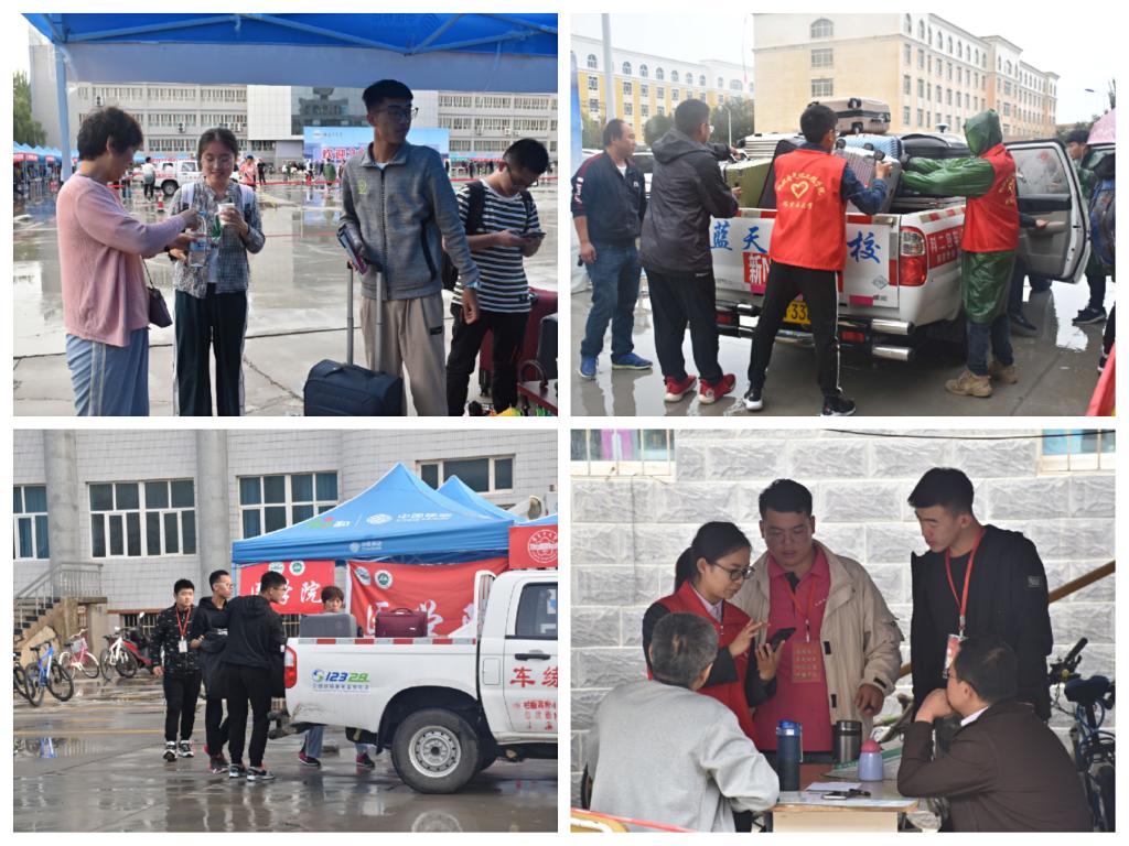 在迎新现场,虽下着倾盆大雨,但依然阻止不了志愿者们热情地服务,有的帮新生拿行李,有的为新生及家长打伞,有的为新生做引导,有的为新生整理床铺……