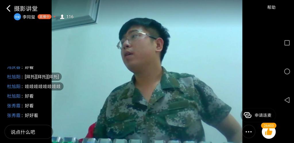 辅导员赵澳正在利用钉钉为线上的同学们上“摄影讲堂,教你零基础摄影”的直播课堂活动。此次活动极大地调动了同学们的积极性,让同学们学到了摄影的知识和技巧,为在今后可用手机或相机更好的记录身边的精彩瞬间打下一定基础。