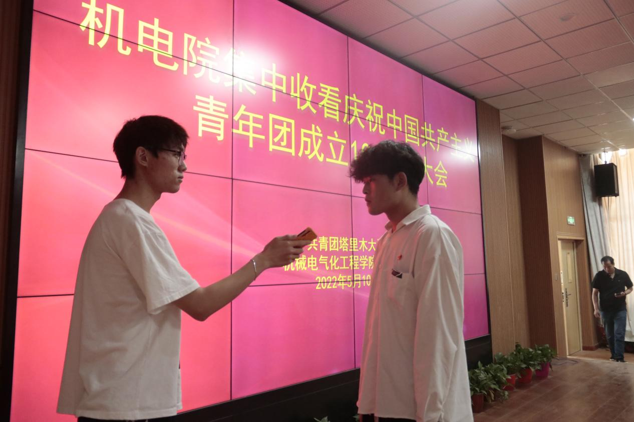机电院院长王旭峰说道:庆祝中国共产主义青年团成立100周年大会上,习近平总书记回顾了共青团的百年征程,寄语新时代青年要有理想、敢担当、能吃苦、肯奋斗。我们要始终牢记共青团的初心使命,铸牢对党忠诚的政治品格,培养担当实干的工作作风,坚持用胡杨精神育人、为兴疆固边服务,做到心系青年,成为党联系青年最牢固的桥梁纽带,持续强化基层团组织建设,扎根学生思想政治教育一线,推动第一、第二课堂深度融合,积极带领青年团员听党话,跟党走,为中华民族伟大复兴中国梦的实现贡献青春力量。