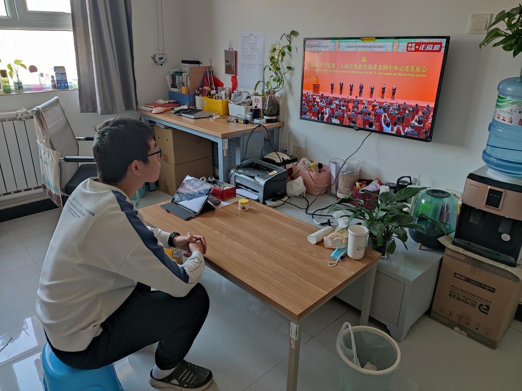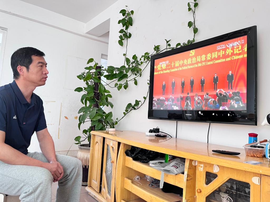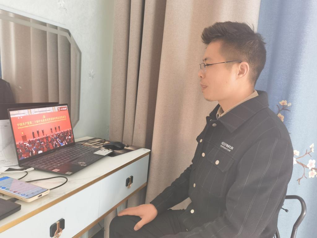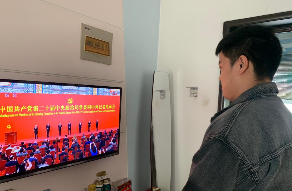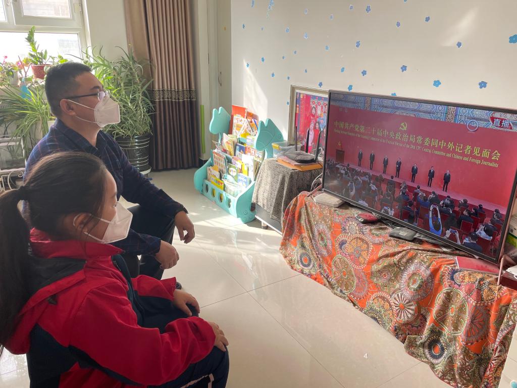 机械工程教师胡灿在阿拉尔市新苑名豪5-6区41号楼1-203室观看中国共产党第二十届中央政治局常委同中外记者见面会。