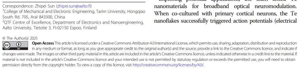 孙志培教授为通讯作者在国际光学和光子学领域期刊《Light: Science & Applications》(Nature子刊,IF=20.6)发表了题为《Beyond visible: giant bulk photovoltaic effect for broadband neuromodulation》的研究论文。