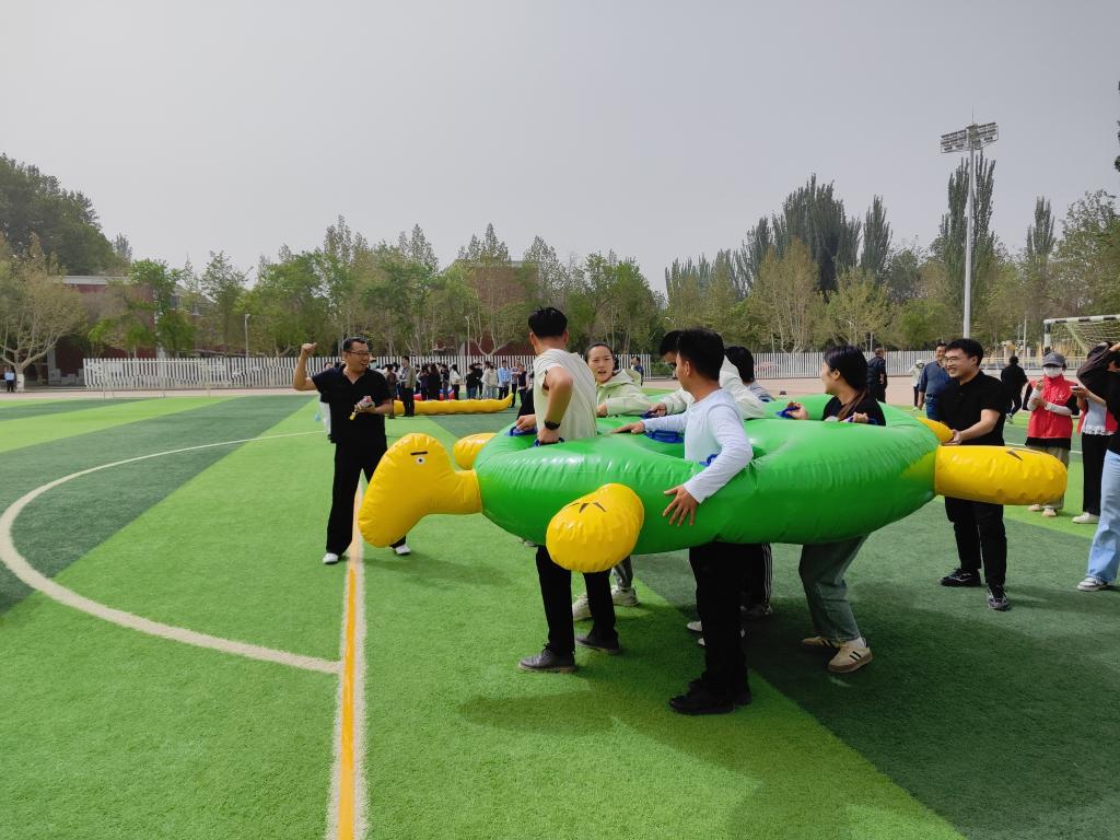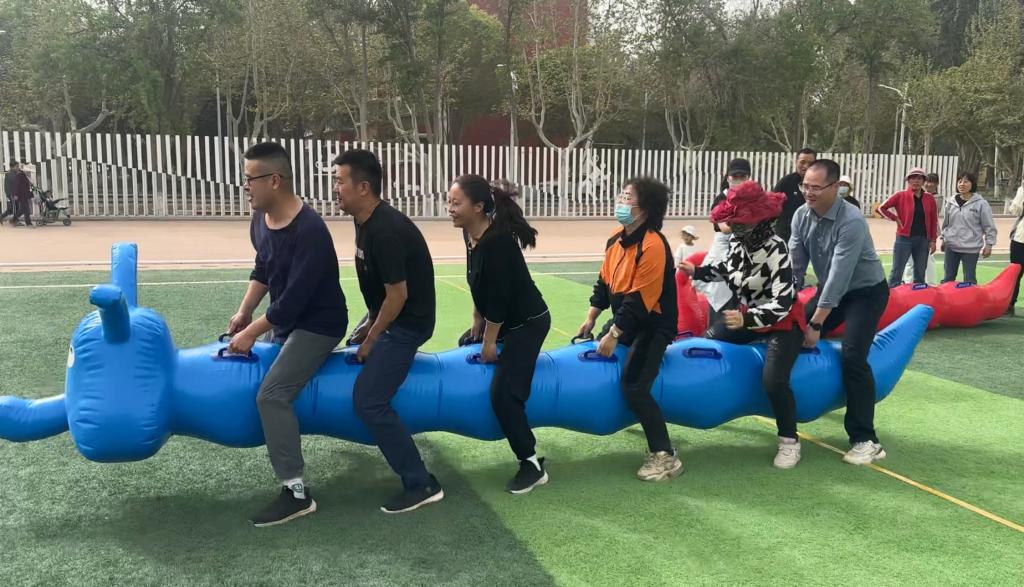 教师3-5人一组,喊着统一的口号稳步前进,尽管步伐偶有失衡,却始终相互扶持、默契配合,现场加油声、欢呼声此起彼伏,将现场气氛推向高潮。